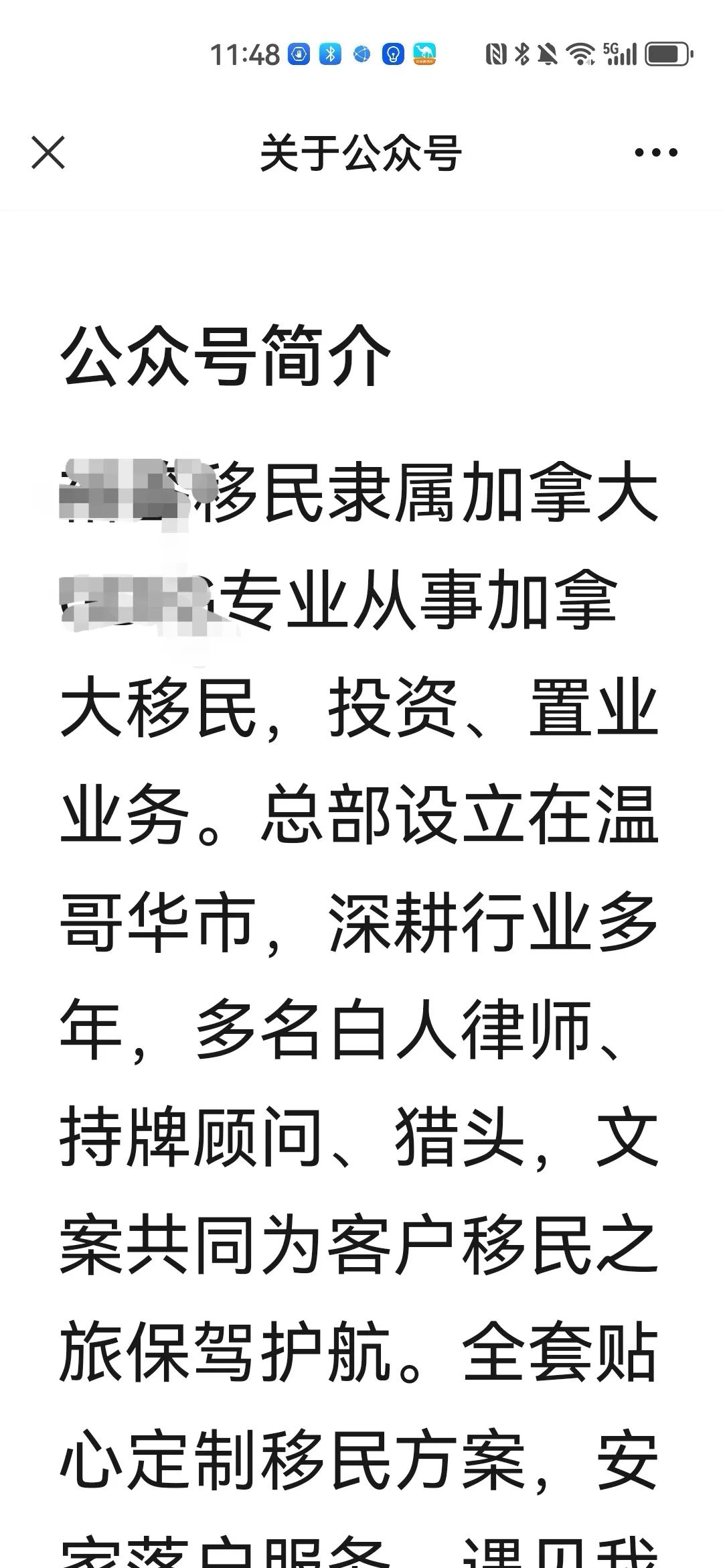 其公众号“YJ移民”的简介页面,看起来很靠谱,怪不得W女士会选择相信了YJ公司。
