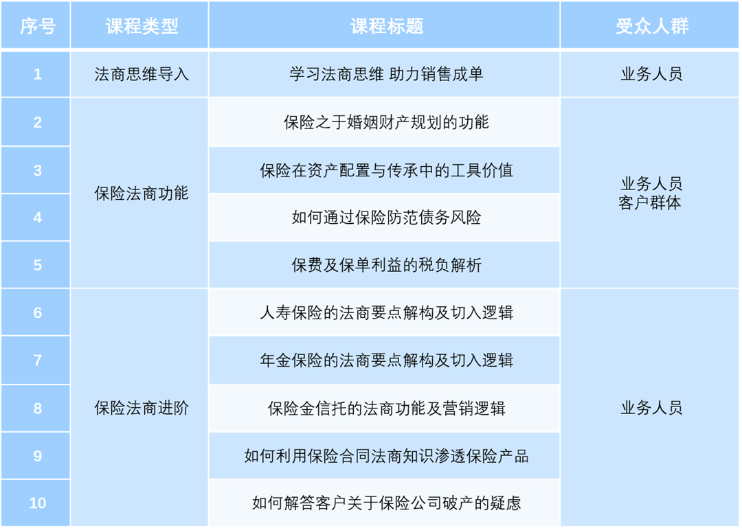 对人身保险公司的培训部而言,保险法商培训服务是完成其年度、季度法商培训工作目标的重要支持,同时也是发挥“培训支持销售增长”作用的表现。
