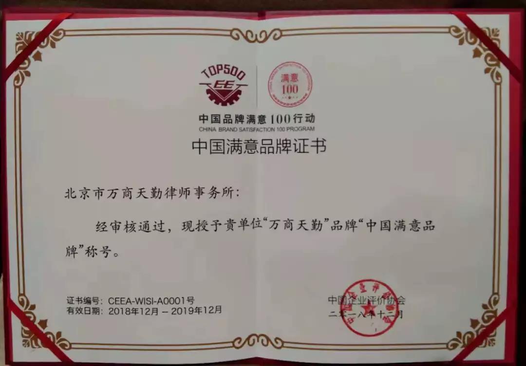 万商天勤获首批“中国满意品牌”荣誉称号,成唯一入选法律服务机构!
